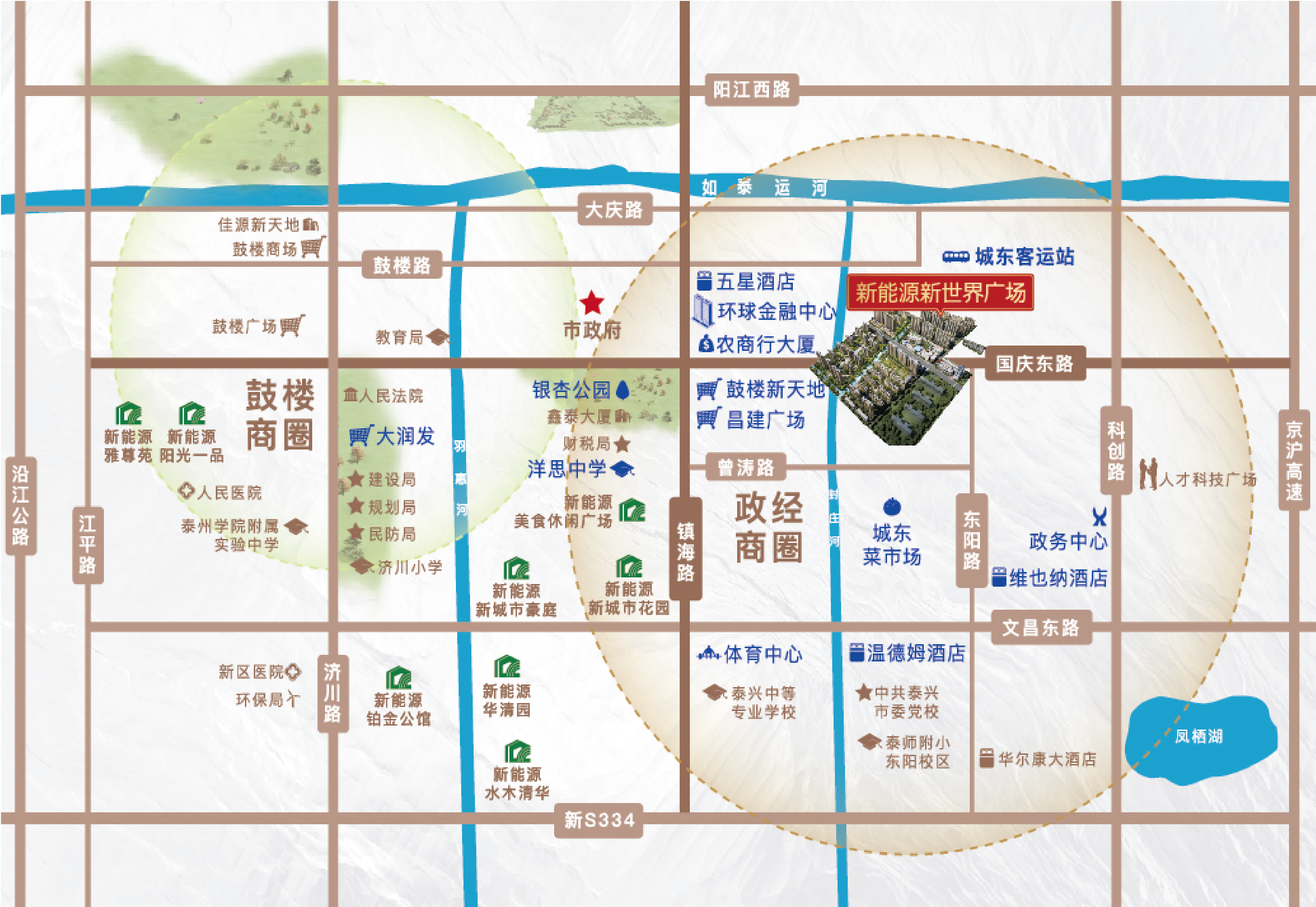 新能源·新世界廣場位于國慶東路與鎮(zhèn)海中路交匯處,是泰興唯一一個125萬方集五大核心優(yōu)勢于一身的的萬戶精英社區(qū)。項目周邊配套醇熟,市政府、大潤發(fā)、環(huán)球金融中心、五星級酒店、體育館以及洋思中學等名校環(huán)繞,自帶19萬方的“公園式商業(yè)”昌建廣場,與泰興鼓樓購物中心合作打造鼓樓新天地,筑就城市新中心。
