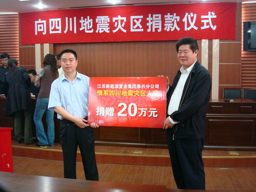 災(zāi)難無情人有情,一方有難八方支援。四川汶川發(fā)生強(qiáng)烈地震的消息傳來,泰興市新能源新城市花園的開發(fā)商江蘇新能源置業(yè)集團(tuán)泰興分公司立即與泰興市政府相關(guān)部門聯(lián)系,于2008年5月15日上午10:30在泰興市政府會議室向?yàn)?zāi)區(qū)人民捐款20萬元,以表達(dá)對災(zāi)區(qū)人民的深情關(guān)愛。