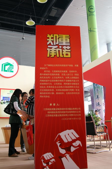 在房展會(huì)開(kāi)幕式上,江蘇新能源置業(yè)集團(tuán)被授予揚(yáng)州市區(qū)優(yōu)秀房地產(chǎn)企業(yè);。同時(shí)在房展會(huì)上江蘇新能源置業(yè)集團(tuán)有限公司、江蘇新能源置業(yè)集團(tuán)有限公司泰興分公司、揚(yáng)州新能源虎豹房屋開(kāi)發(fā)有限公司、揚(yáng)州鴻澤置業(yè)有限公司為了確保業(yè)主購(gòu)買的房屋資產(chǎn)保值,向社會(huì)作出鄭重承諾:即日起凡是新購(gòu)買和美第、花樣年華、泰興新城市花園的房屋,買受人自訂立《商品房買賣合同》之日起兩年內(nèi),如果上述樓盤(pán)在同幢房屋中出現(xiàn)銷售價(jià)格低于該幢樓開(kāi)盤(pán)公示價(jià)的降價(jià)行為。公司承諾:將把差價(jià)全額返還給業(yè)主,并承擔(dān)業(yè)主從買房之日起至降價(jià)之日止已交房款的利息,利率標(biāo)準(zhǔn)按照銀行同期一年定期存款利率計(jì)算。