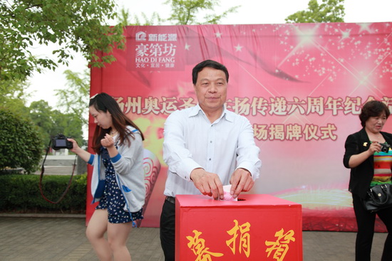 5月26日是北京奧運(yùn)圣火在揚(yáng)傳遞六周年紀(jì)念日。5月25日上午,中國(guó)火炬手聯(lián)合會(huì)執(zhí)行主席、中國(guó)奧運(yùn)火炬手協(xié)會(huì)理事長(zhǎng)黃海軍等領(lǐng)導(dǎo)專(zhuān)程從北京來(lái)?yè)P(yáng),與揚(yáng)州部分奧運(yùn)火炬手聚會(huì),并為坐落在新能源豪第坊的火炬廣場(chǎng)揭牌。在活動(dòng)現(xiàn)場(chǎng),部分火炬手還當(dāng)場(chǎng)捐款,為火炬廣場(chǎng)體育設(shè)施建設(shè)添一把柴。為助力北京申辦2022年冬奧會(huì),火炬手們還在條幅上簽名,表達(dá)揚(yáng)州火炬手的心聲。