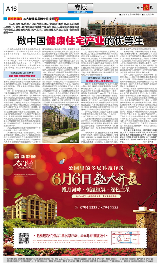 有人經(jīng)常會問,房地產(chǎn)公司為什么冠以新能源;的頭銜,其實這就是文章的中心思想。因為新能源和健康產(chǎn)業(yè)密切相關(guān),江蘇新能源置業(yè)集團有限公司從誕生的那天起,就一直以打造健康住宅產(chǎn)業(yè)為己任,公司的愿景是做中國健康住宅產(chǎn)業(yè)的優(yōu)等生