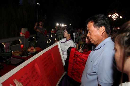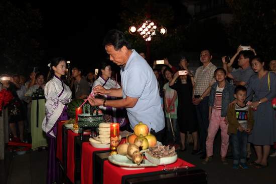 晚宴結(jié)束之后,在舒緩優(yōu)雅的樂曲聲中,拜月儀式正式開始。主拜江蘇新能源置業(yè)集團(tuán)董事長包廣林點(diǎn)燃三炷香,向月神鞠躬、上香,6名嫦娥;分列左右,廣大業(yè)主在主拜的引導(dǎo)下紛紛向月神祈愿,共同為美好明天和幸福生活祈福,一場古老的拜月儀式;完美上演。
